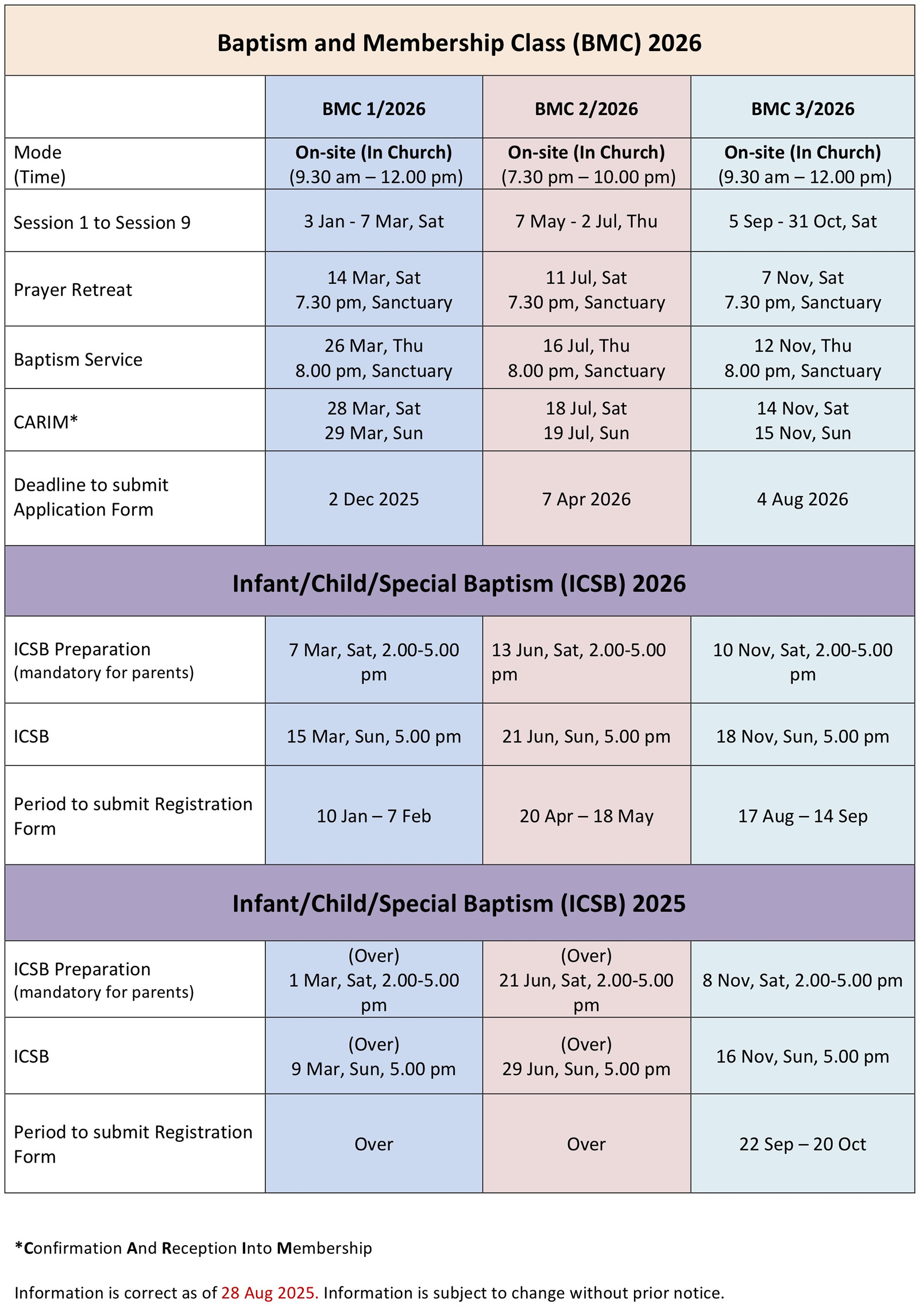 Check out the Baptisms and BMC Schedule below. Please note that course details can be subjected to change and registered candidates will be notified accordingly.
